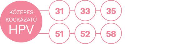 - Közepes kockázatú HPV-típusok, melyek gyakrabban találhatóak meg a méhnyak daganatmegelőző állapotaiban, mint a rosszindulatú daganatokban.5